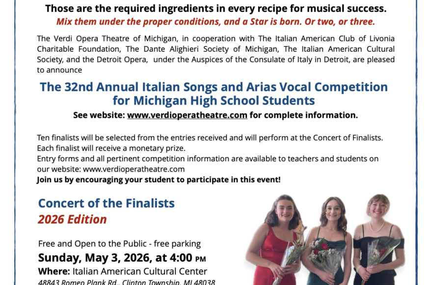 The 32nd Annual Italian Songs and Arias Vocal Competition for Michigan High School Students . See the website at www.verdioperatheatre.com for complete information.